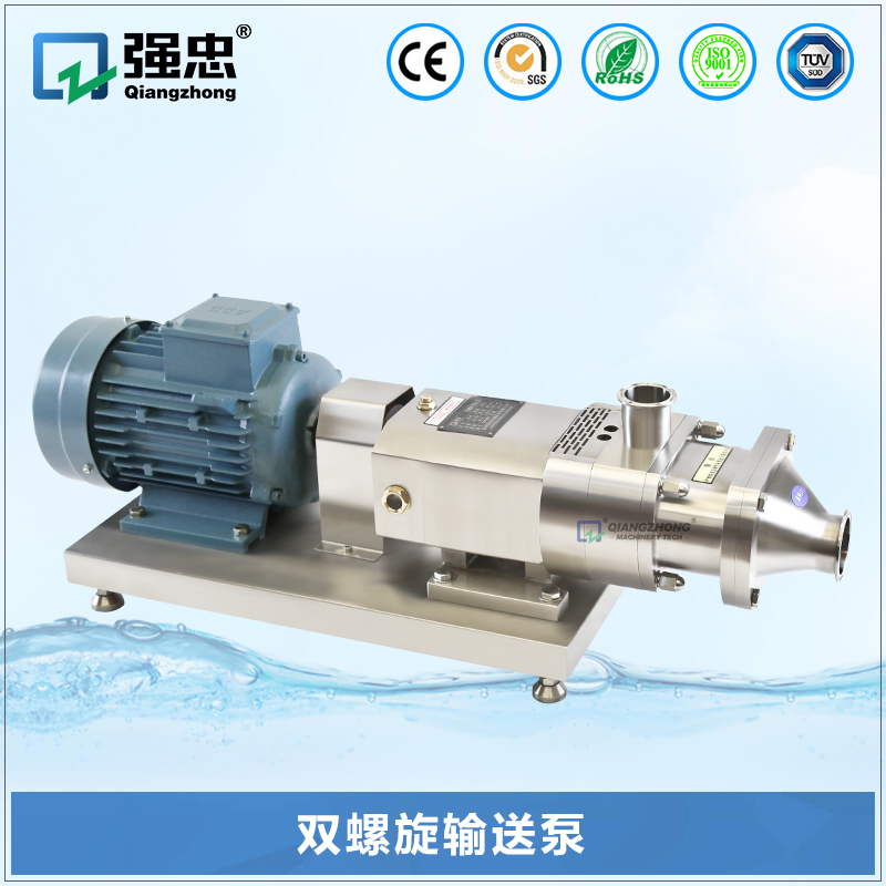双螺旋输送泵采用开放式、模块化的卫生结构,整个系统由泵体,传动齿轮箱,电机三个主要部分组成。所有和物料接触的部分都采用高等级优质304/316L不锈钢,传动部分也采用球墨、304不锈钢和铸钢三种材质,保持设备的高等级、高质量。作为整个系统核心部件的泵体,由前腔盖、腔体、螺旋转子、传动轴、机封腔体、机械密封等部分组成。传动轴采用粗壮加强型设计,通体一体化结构,选用优质的、高强度的特殊沉淀不锈钢材料,经过固熔和硬化处理。